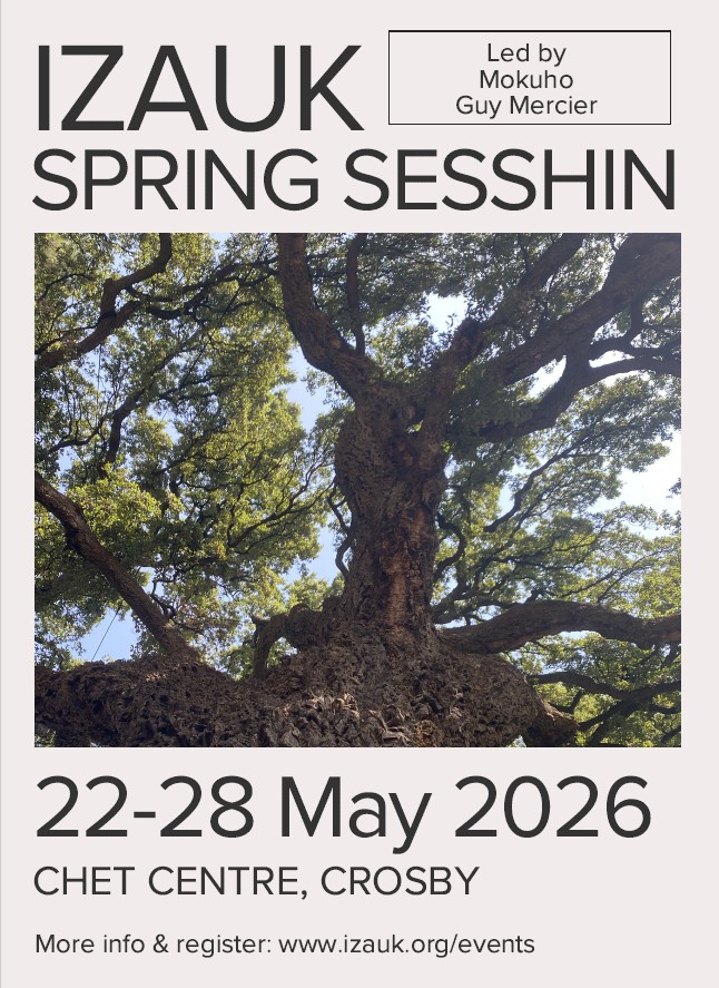 This will be a 6-day sesshin, in the Soto Zen tradition, including a Jukai ceremony; the giving and receiving of precepts. This means to take refuge in the three treasures: Buddha, Dharma and Sangha. The Friends of IZAUK Annual General Meeting will take place during this week.